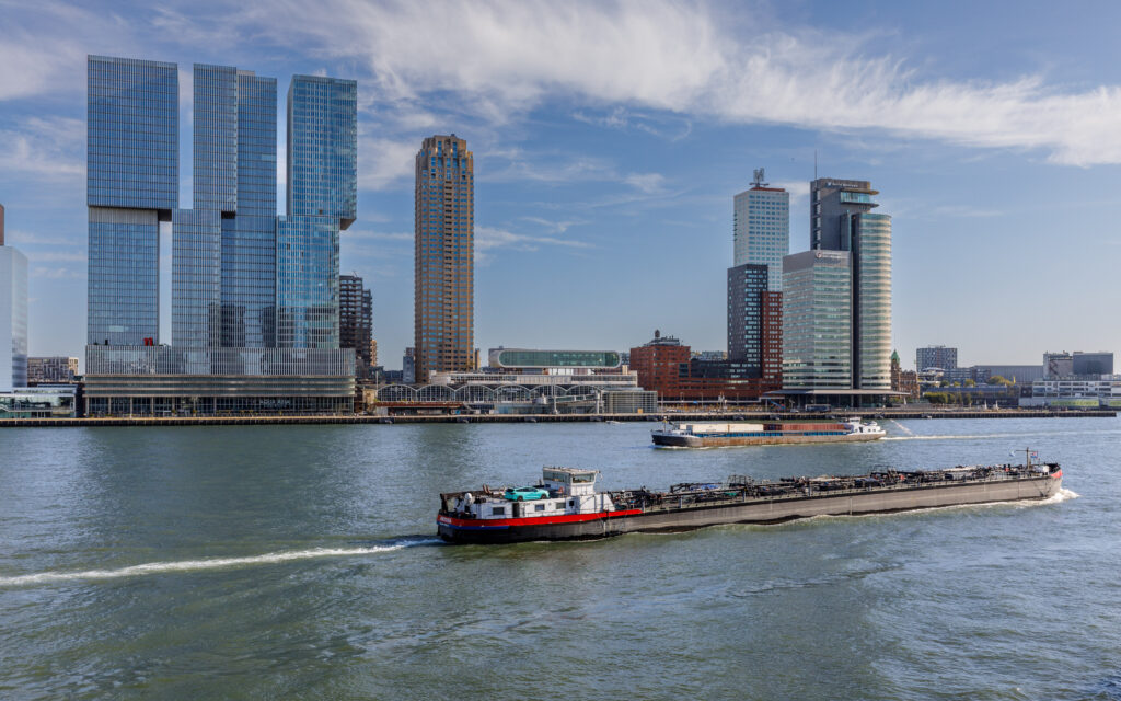 Uitzicht op de skyline van Rotterdam, met het water altijd dichtbij.