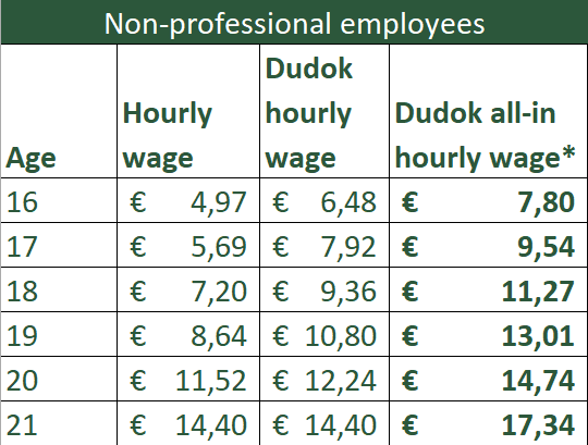 At Dudok Horeca Groep, we deviate from the legal minimum youth wage and apply the following hourly rates.