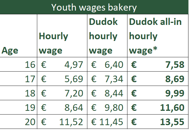 At Dudok Horeca Groep, we follow the Bakers’ Collective Labour Agreement (CAO Bakkersbedrijf) and the corresponding salary tables: