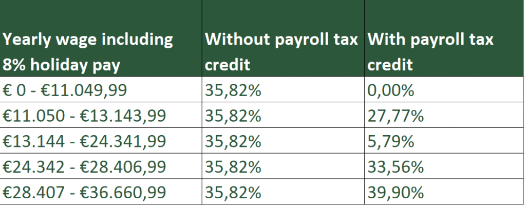 If you apply the payroll tax credit at Dudok, you do not pay income tax on your wages if you earn less than €715.50 per month.